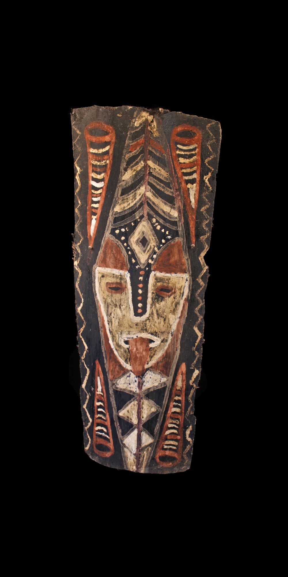Ecorce peinte collectée dans la région Kwoma en Papouasie Nouvelle Guinée. Ces peintures sur écorce de palmier sagoutier décorent les faces internes des toits ainsi que les frontons des maisons de cérémonie et représentent de manière abstraite ou figurative les ancêtres ou croyances des clans. Assemblées les unes aux autres, elles tapissent ainsi les plafonds de ces grandes cases prestigieuses. Le Métropolitain Museum of Art de New York présente dans sa collection permanente la reconstitution complète d'un toit de case ainsi décoré d'écorces peintes de ce type... Morceau d'écorce de sagoutier et pigments naturels. Possibilité de socle sur demande (60 euros en sus).