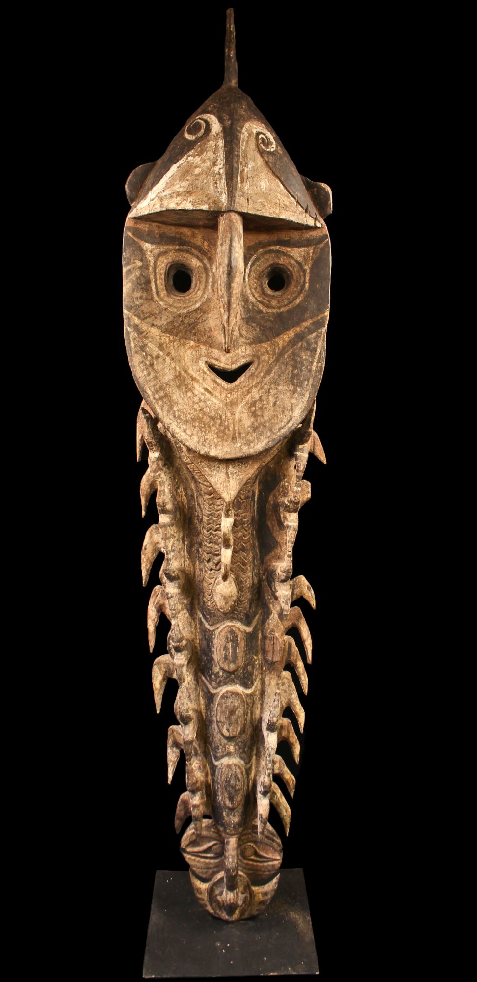 Really impressive and huge Minja figure showing a water spirit that evokes fertility. This figure is used during a ceremony to celebrate the yam harvest and symbolises the growing period of thoses sacred tubers. Hard wood and natural pigments. Used tracks and lacks. Sold with a base.