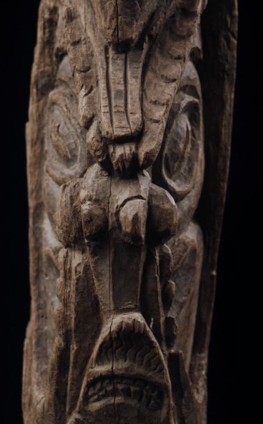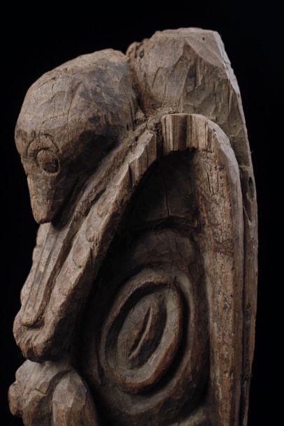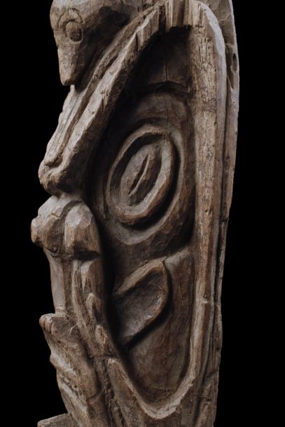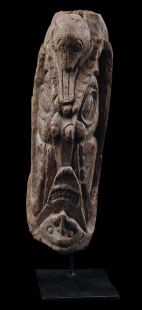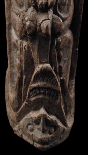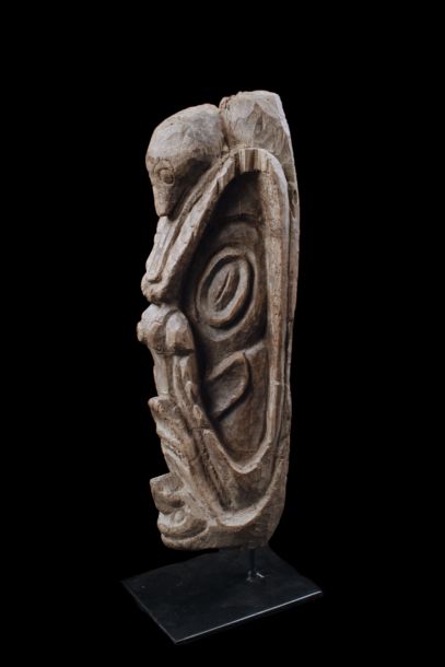 Etrange sculpture de culte présentant un entrelacs de visages et de têtes d'animaux (crocodile, opossum). Ce type de figure fait référence aux croyances animistes très largement répandues en Papouasie Nouvelle Guinée. Pièce unique collectée dans la région des lacs Murik à l'embouchure du Fleuve Sépik. Sculpture montée sur socle en métal.