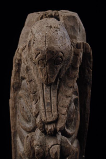 Strange cult sculpture featuring an interlacing of animal faces and heads (crocodile, opossum). This type of figure refers to the animist beliefs widespread in Papua New Guinea. Unique piece collected in the Murik Lakes area at the mouth of the Sepik River. Sculpture mounted on a metal base. Approx. 39 x 12 cm / €300 including base and shipping costs for Europe / USA €70 extra costs.