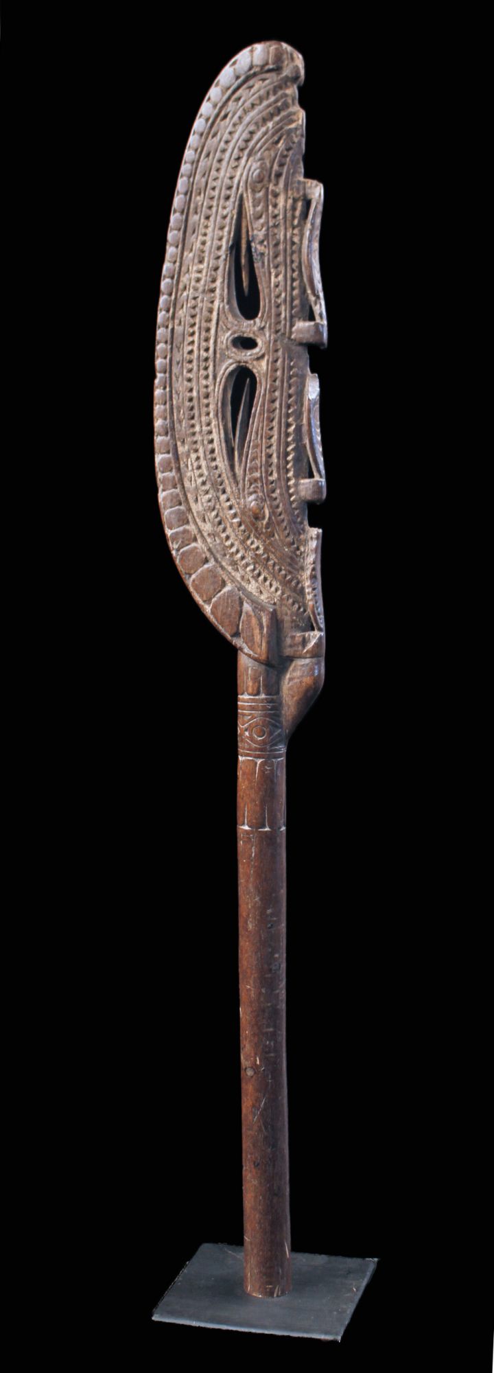 Old paddle extremity showing tribal patterns finely carved. Taken up on base. Beautiful used patina.