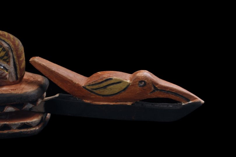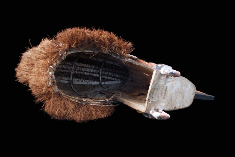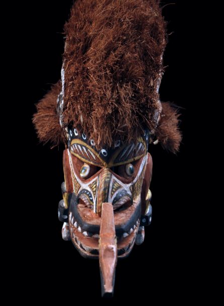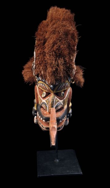 Malagan dance mask collected on the Tabar Islands in Papua New Guinea. This mask called "Tatanua" represents the soul of a person and serves in commemoration ceremonies. These relatively light wooden masks are worn during ritual dances. Wood, vegetal fibers including coconut, coconut bark, pigments and shells. Sold with a stand.