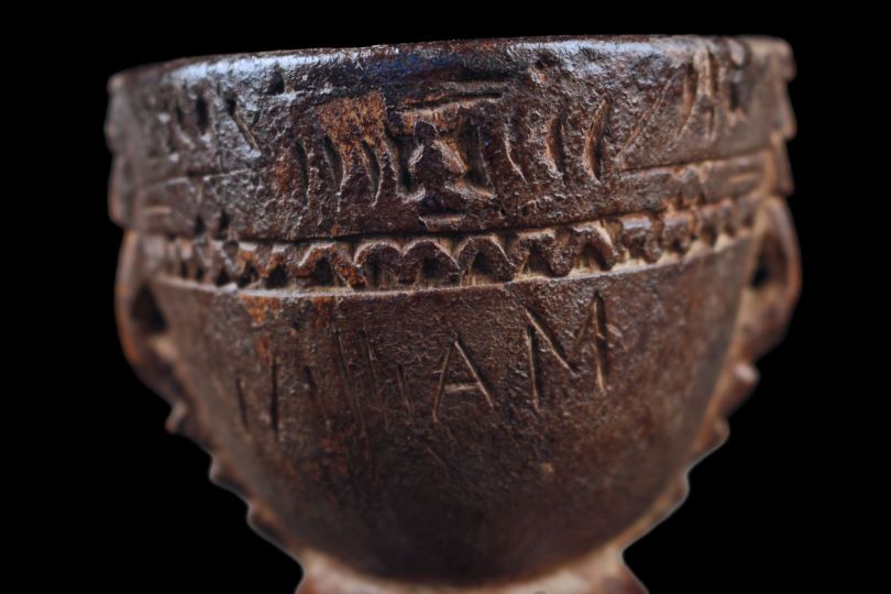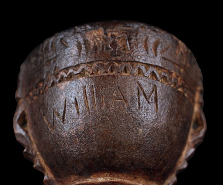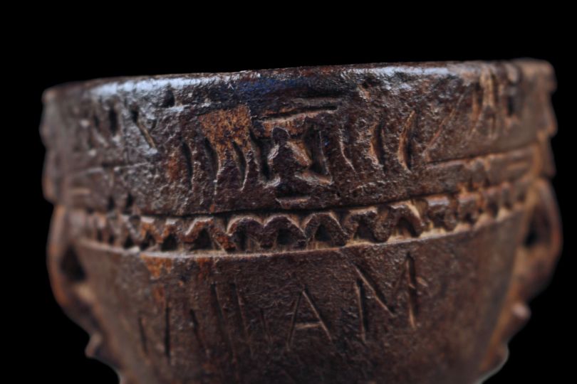 Arapesh betel mortar with a very nice patina. Good condition. Name engraved of the former owner. Elderly and toothless people use this type of mortar to crush the betel nuts (also called arec nuts) before chewing them.