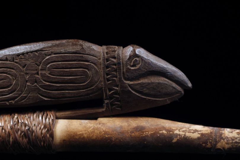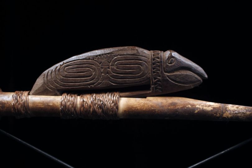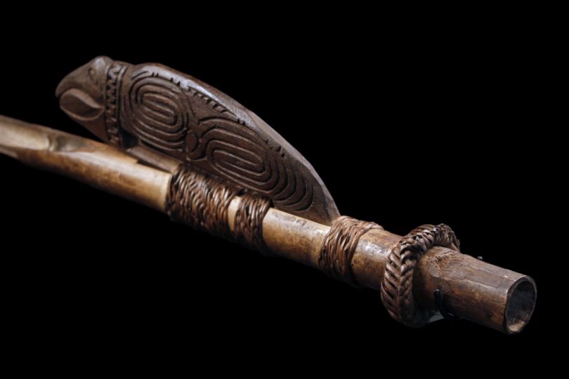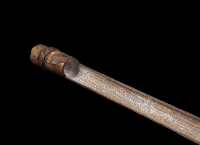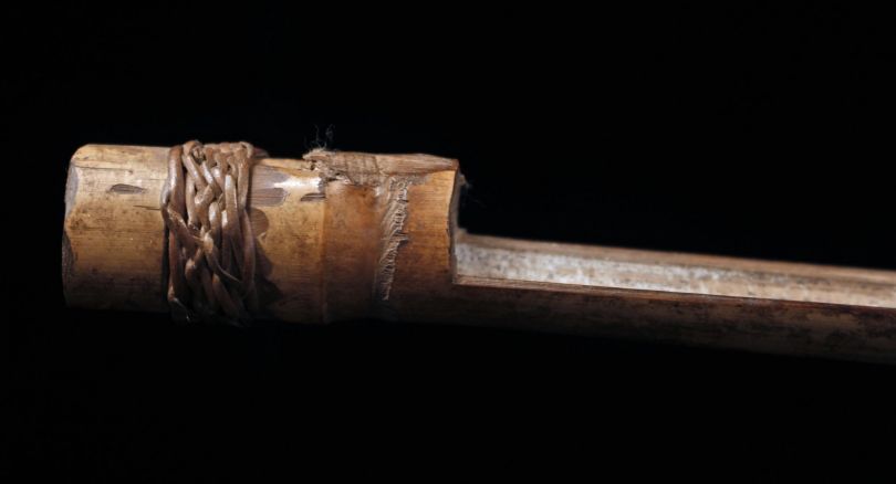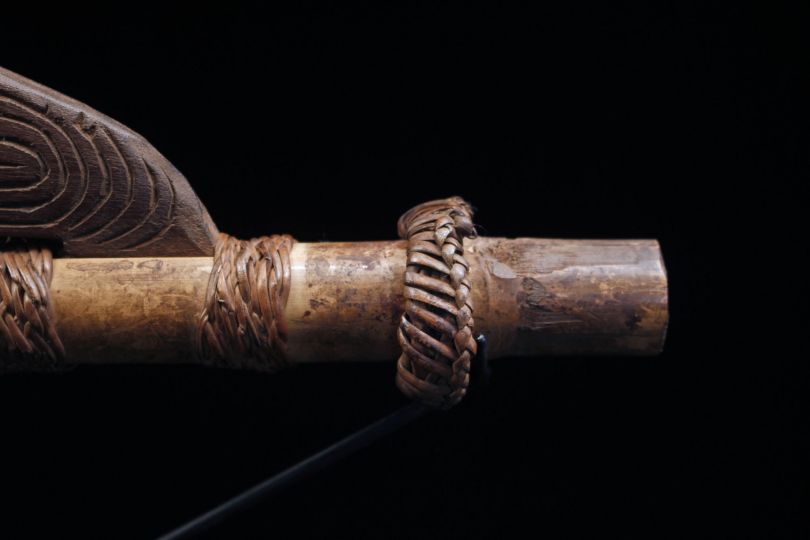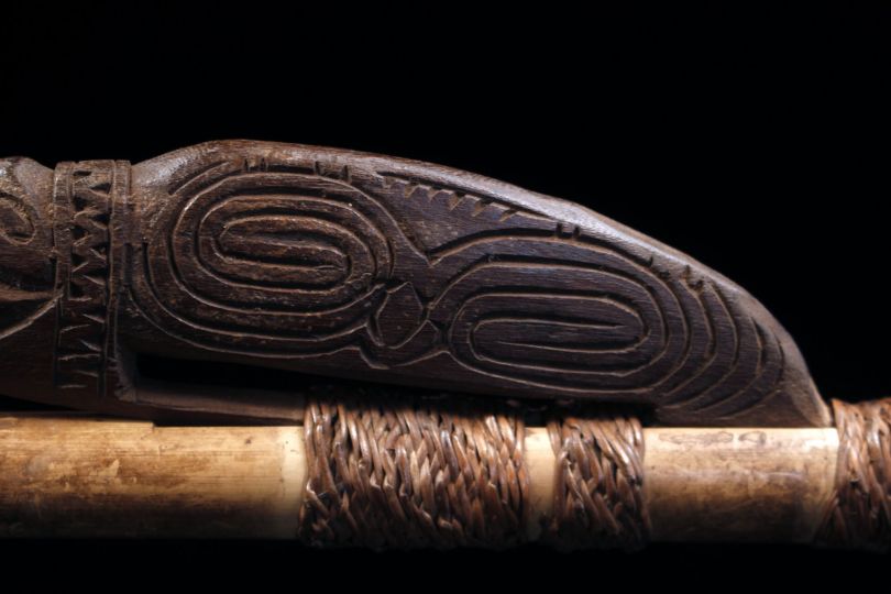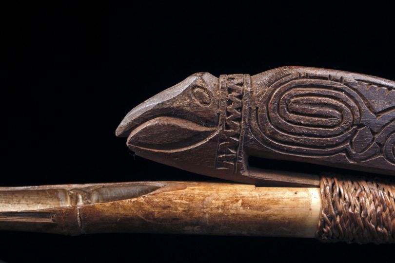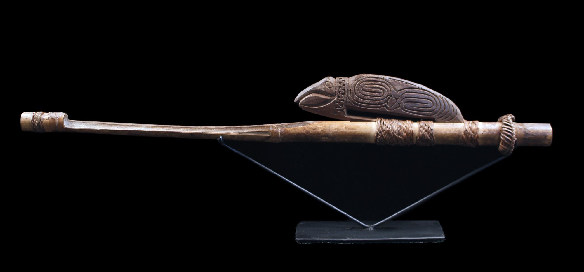 Rare hunting or combat arrow thrower. The guide represents a sculpted animal (bird? opossum? frog ?). Beautiful used patina. Bamboo, wood and wicker. Sold with a presentation base..