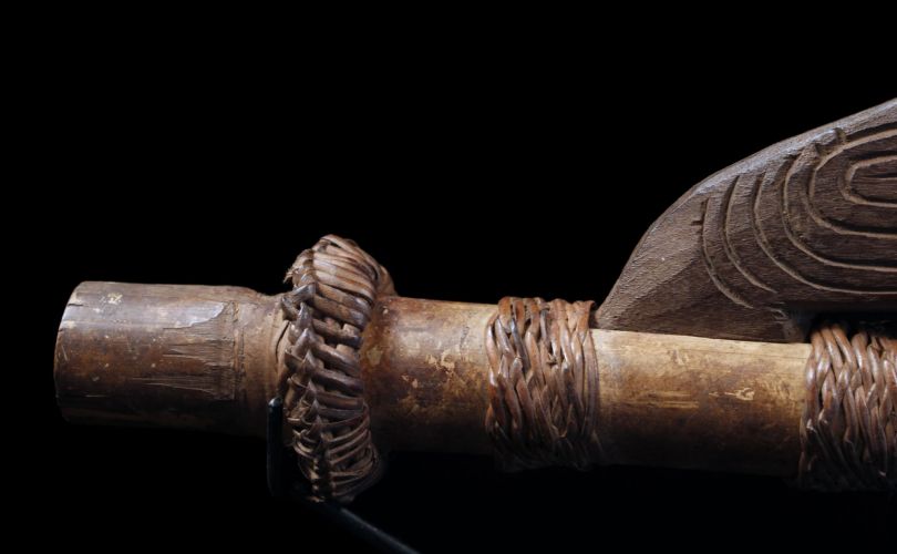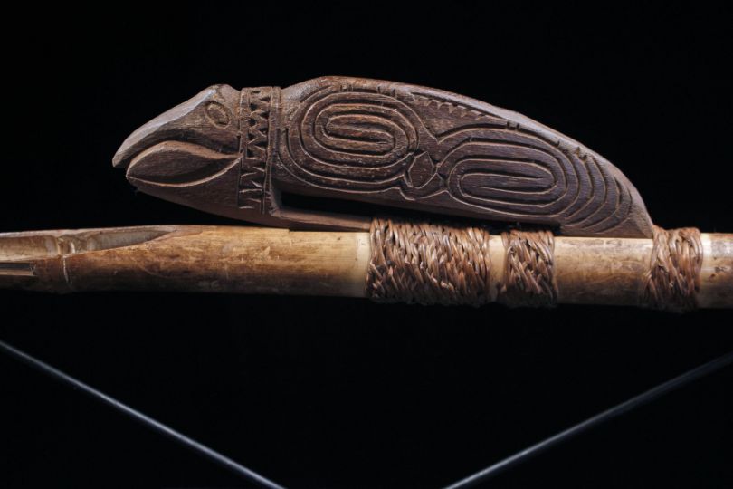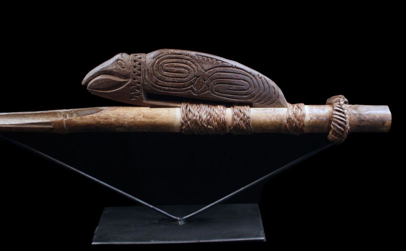 Rare propulseur de flèches de chasse ou de combat. Le guide représente un animal sculpté (oiseau ? opossum ? grenouille ?). Belle patine d'usage. Bambou, bois et osier. Vendu avec un socle de présentation..