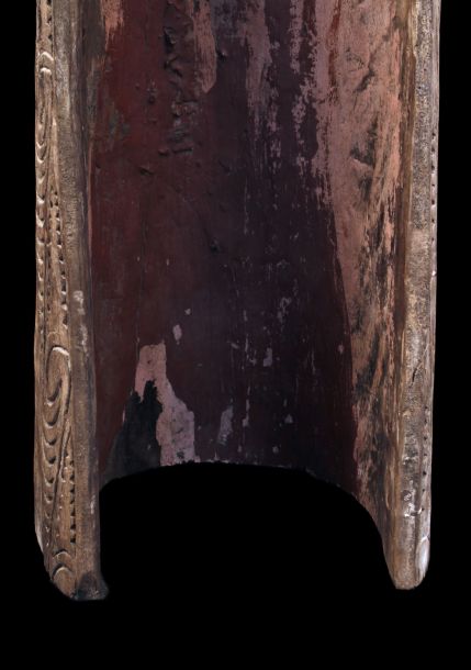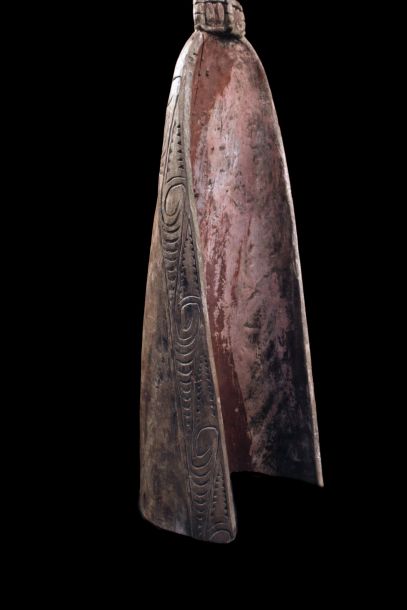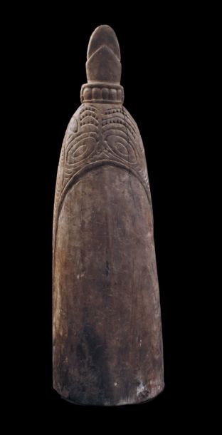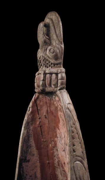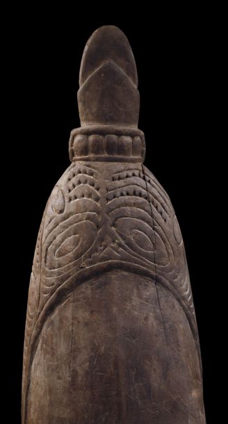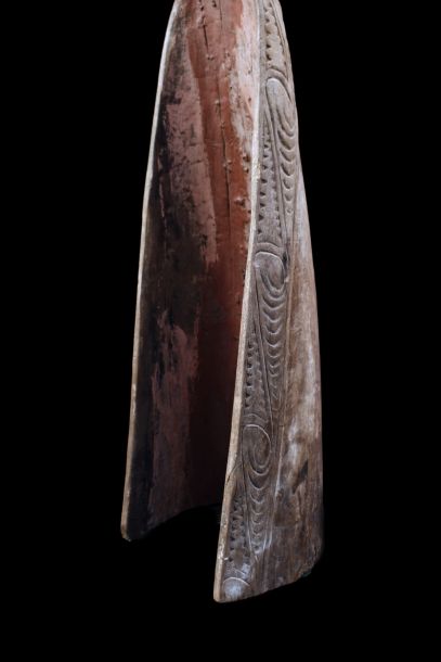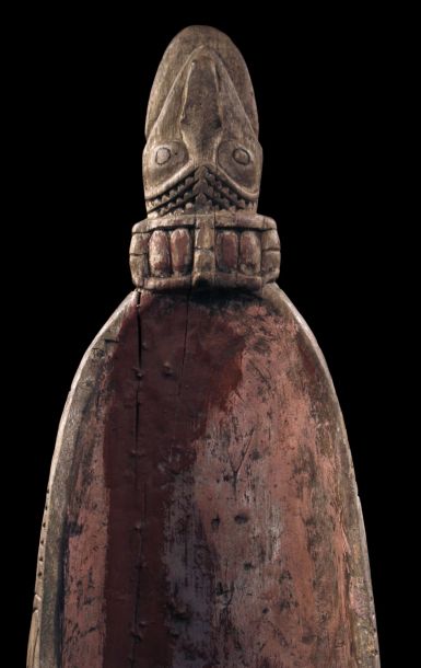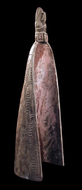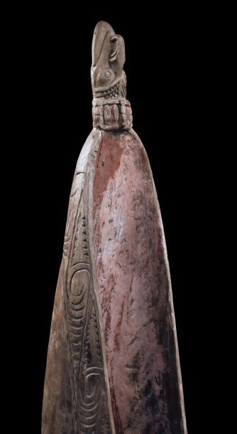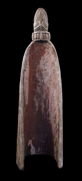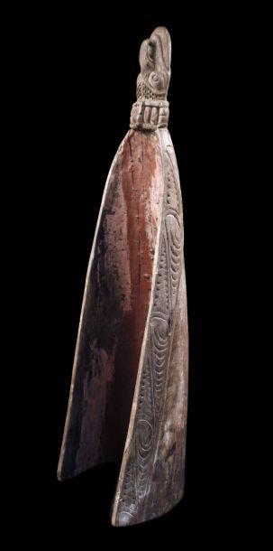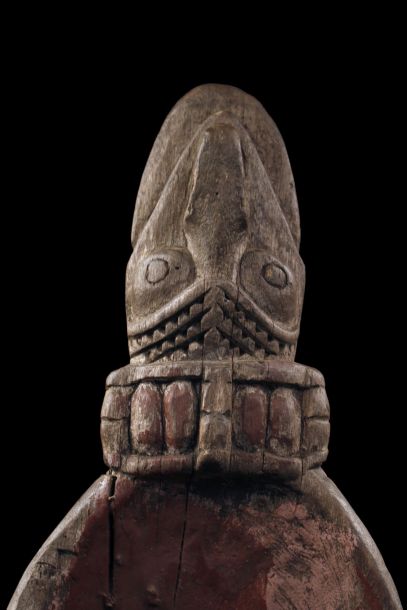 Ancienne proue de pirogue de la région de la rivière Ramu en Papouasie Nouvelle Guinée. Sculpture montrant un visage stylisé zoo-anthropomorphe typique de cette région de l'embouchure du fleuve Sépik. Bois présentant des traces d'usage et restes de polychromies. Belle pièce d'art tribal chargée d'histoire.