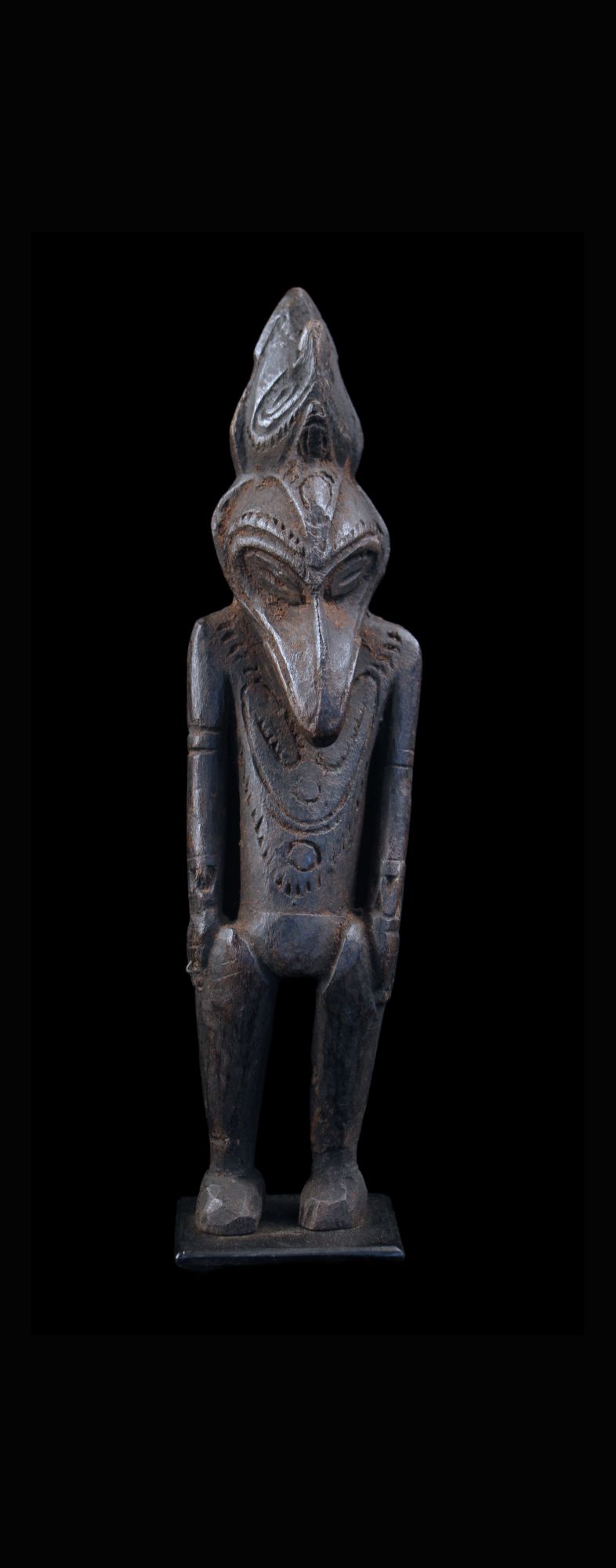 Statuette collectée dans la région du bas Sépik en Papouasie Nouvelle Guinée et representant un ancêtre spirituel mi-homme mi-oiseau au corps scarifié. Deux visages janus en partie haute, style typique de la région de l'embouchure du Sépik. Figure montée sur socle. Bois.