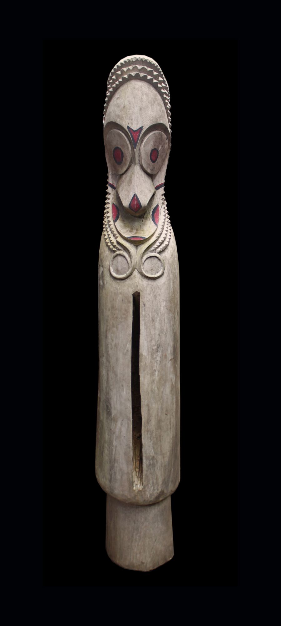 Grand tambour à fente du Vanuatu en arbre à pain. Les tambours à fente de l'île d'Ambrym servent encore de nos jours à communiquer au sein des villages. Ces formes majestueuses, typiques de l'île d'Ambrym, font que ces totems tambours sont devenus l'un des symboles forts de cette région du Pacifique Sud. Evocation de dents recourbées de cochons (symbole de prospérité) sous ce visage stylisé. Sculpture totem pouvant être exposée en extérieur comme en intérieur.