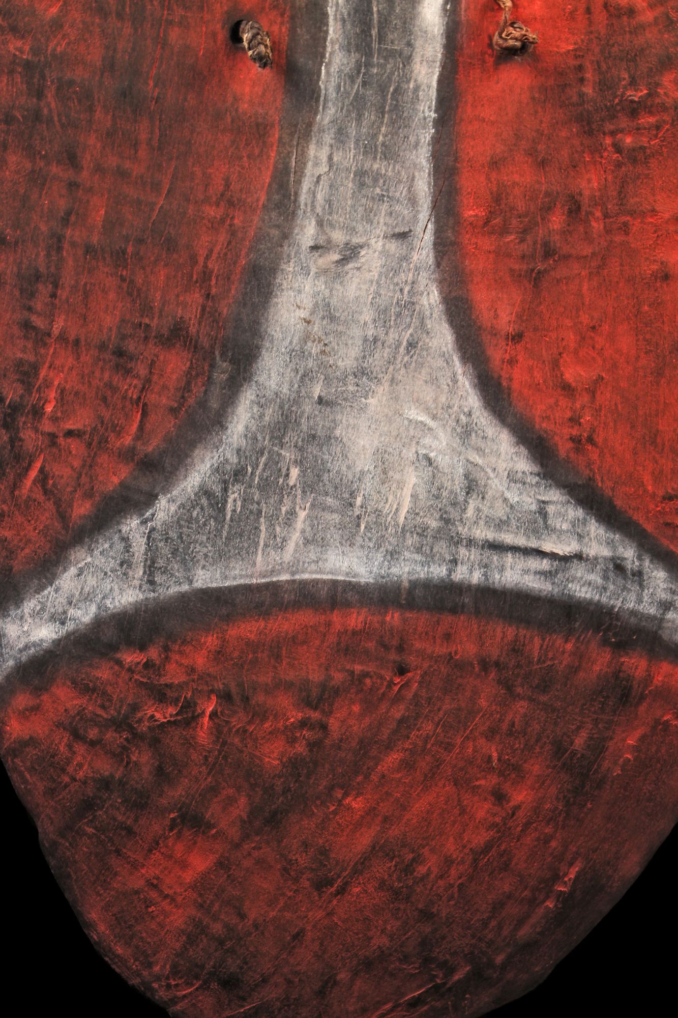 Bouclier de guerre papou en bois dense, particulièrement décoratif, collecté dans la région des Highlands en Papouasie Nouvelle Guinée. Bois, fibres végétales et pigments naturels.