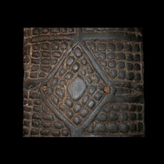 Carved shield that refers to the crocodile skin. The lines make a traditionnal drawing from a clan. Wood.