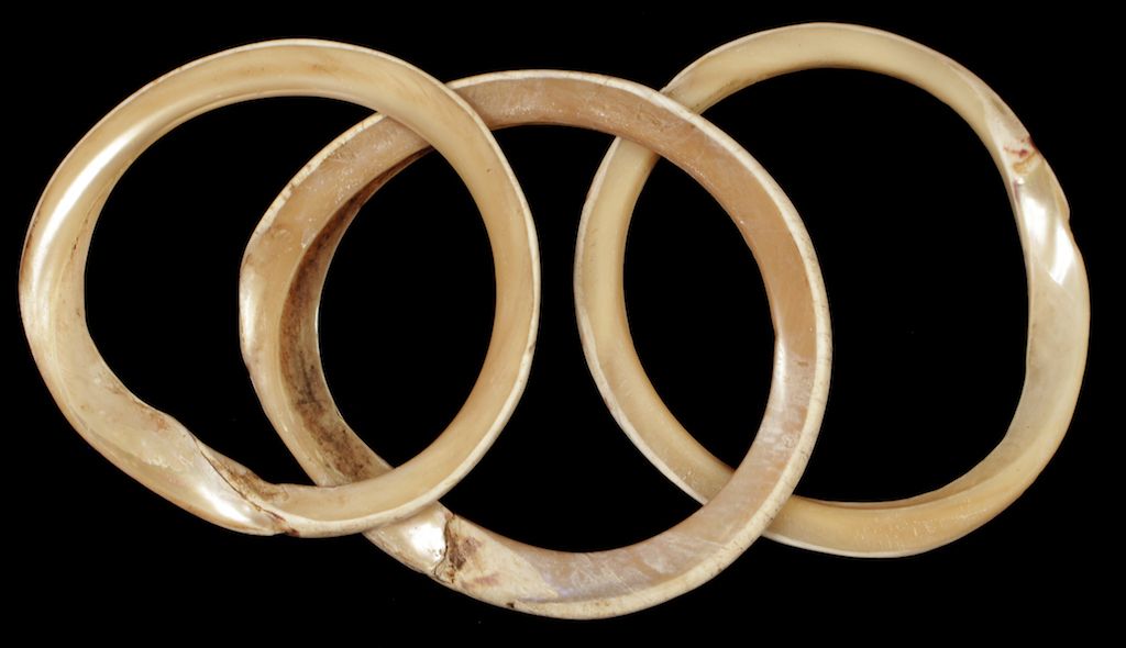 Set of three traditional bracelets of splendor. Made from Troca shells, these bracelets were carried above the elbow.