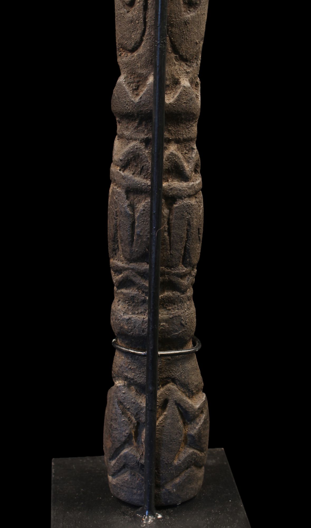Bâton de danse en bois noirci entièrement sculpté de dessins tribaux évoquant des plantes et animaux totémiques (dont grenouilles stylisées en partie basse). Collecté sur les berges du fleuve Sépik en Papouasie Nouvelle Guinée. Vendu avec un socle de présentation.