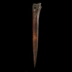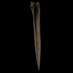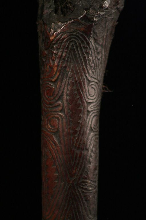 Dague de combat en os (fémur de casoar). Très belle patine d'usage. Motifs gravés présentant des dessins tribaux complexes typiques de l'ethnie Abelam. Têtes de cacatoès évoquées en partie haute. Vendue avec un socle de présentation.