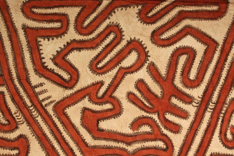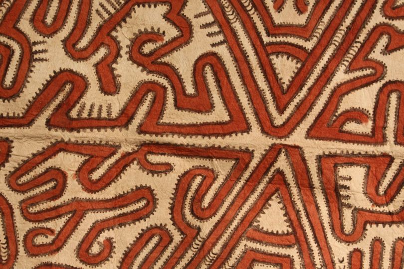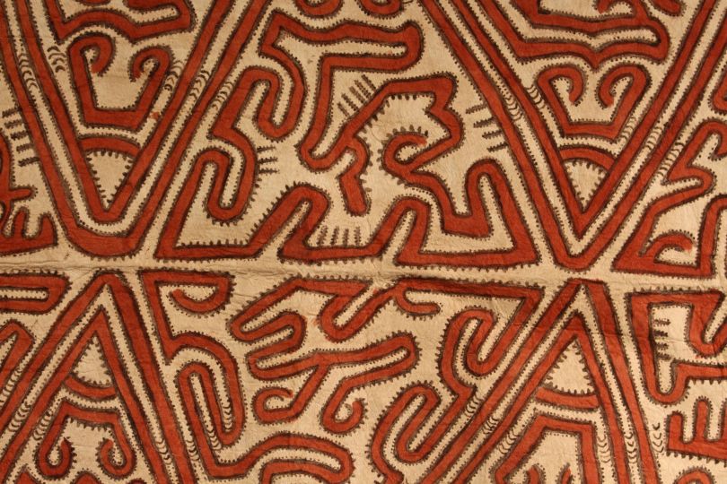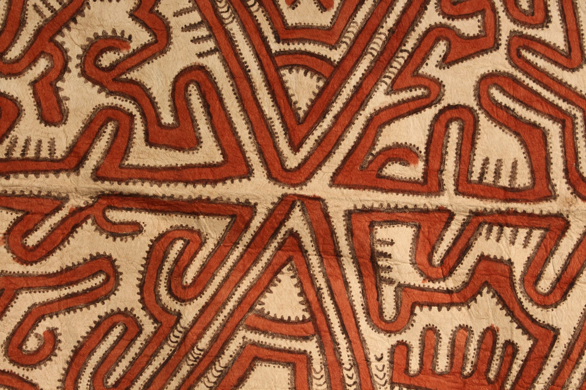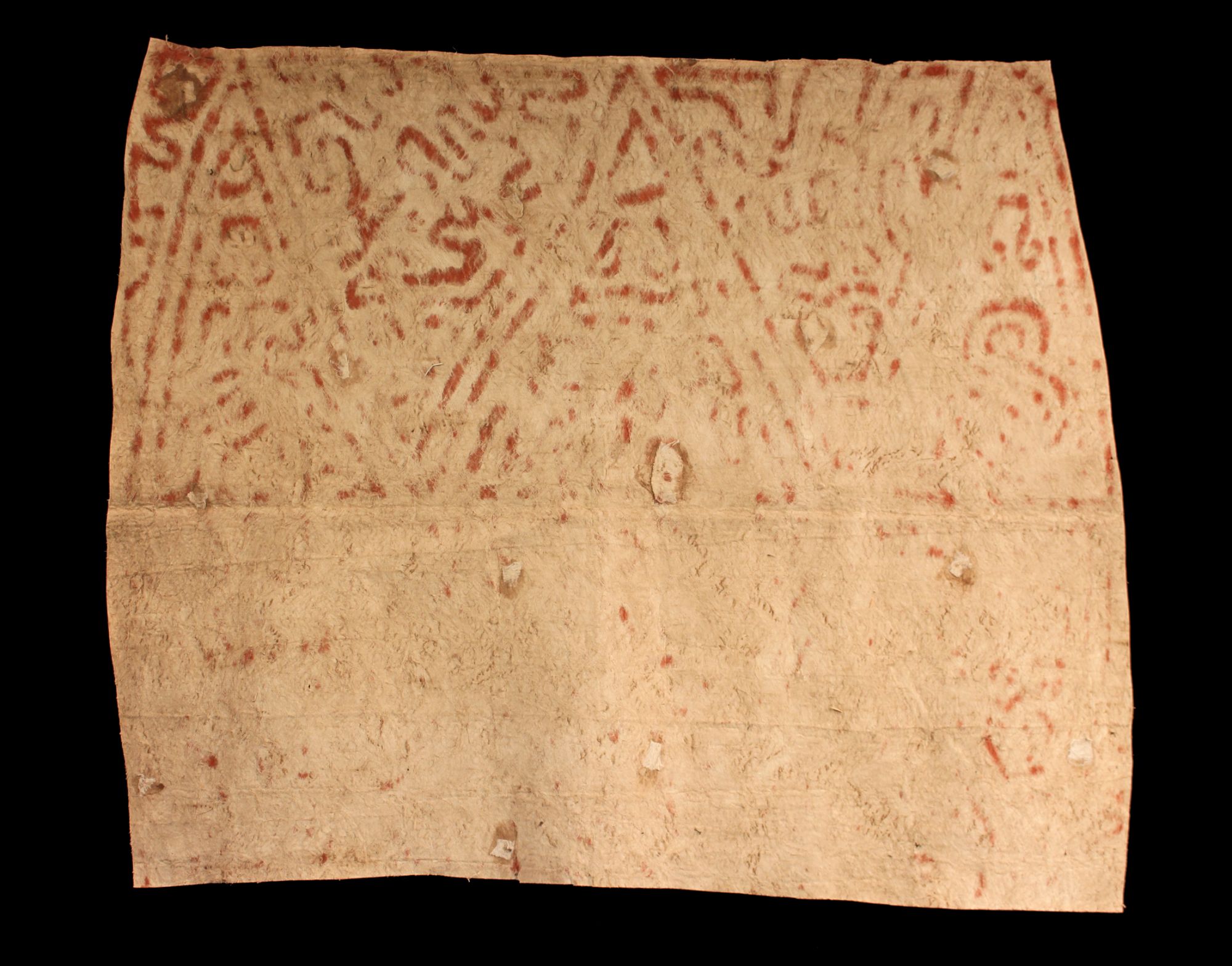 Fragment de jupe de danse en tapa collecté dans la région de Popondetta en Papouasie Nouvelle Guinée. Le tapa est la première étoffe dont on ait disposé dans cette région du monde. Ses usages étaient variés : vêtement, linceul, couverture, moustiquaire, sac, monnaie de prestige pour certaines pièces de grande qualité. Les tapas de la région de Popondetta sont faits à partir de l'écorce du mûrier à papier et servent de jupes de danse. L'écorce est extraite, humidifiée, battue, sèchée. Le fait de la battre tasse les fibres et les soude entre elles. Selon le type de battage, l'épaisseur, la texture et la souplesse de l'étoffe varient. Les motifs dessinés évoquent de manière abstraite et symbolique un certain nombre d'événements ou de faits importants. Ecorce battue et pigments naturels. Très beau encadrée entre 2 verres.