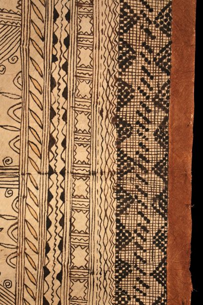 Painted beated bark called Tapa collected in the 50-60th in Wallis & Futuna islands' area. Tapa cloth is the first material in this region of the world that has been available for people to make clothes, covers, mosquitoe nets, exchange currency etc. Tapa cloth from Wallis and Futuna area are made from the bark of the blueberry tree. The intenal bark is extracted, moistened, beaten, and dried. The fact of beating it compresses fibers and soda between them. The drawn motives evoke in a abstract and symbolic way important facts, traditional myths and legends. In Europe, it is to envisage as a painting that we could put in the wall. Beatted bark and natural pigments.