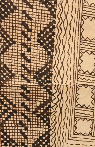 Tapa collecté à Wallis & Futuna dans les années 50-60. Le tapa est la première étoffe dont on ait disposé dans le Pacifique. Ses usages étaient variés : vêtements, linceuls, couvertures, moustiquaires, sacs, monnaie de prestige. Les tapas de la région de Wallis et Futuna sont faits à partir de l'écorce du mûrier à papier. Le liber de l'écorce est extrait et mis à rouir avant d'être battu et seché. L'écorce est frappée à l'aide d'un maillet ou battoir à tapa qui tasse les fibres et les soude entre elles. Les motifs dessinés évoquent de manière abstraite et symbolique des évènements importants, des mythes et légendes ancestraux. En europe, le tapa est à envisager comme une peinture que l'on mettrait au mur. Ecorce battue et pigments naturels. Belle pièce en très bon état général.