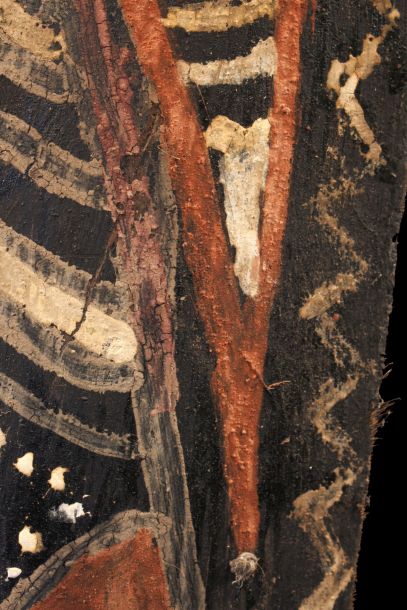 Ecorce peinte collectée dans la région Kwoma en Papouasie Nouvelle Guinée. Ces peintures sur écorce de palmier sagoutier décorent les faces internes des toits ainsi que les frontons des maisons de cérémonie et représentent de manière abstraite ou figurative les ancêtres ou croyances des clans. Assemblées les unes aux autres, elles tapissent ainsi les plafonds de ces grandes cases prestigieuses. Le Métropolitain Museum of Art de New York présente dans sa collection permanente la reconstitution complète d'un toit de case ainsi décoré d'écorces peintes de ce type... Morceau d'écorce de sagoutier et pigments naturels. Possibilité de socle sur demande (60 euros en sus).