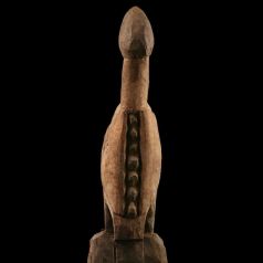 Sculpture en bois dense représentant une tête stylisée d'ancêtre surmontée d'un oiseau calao, animal symbole de sagesse. Bois et traces de polychromie. Montée sur plaque métallique.