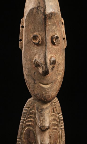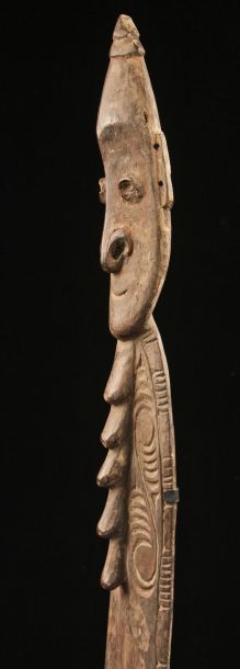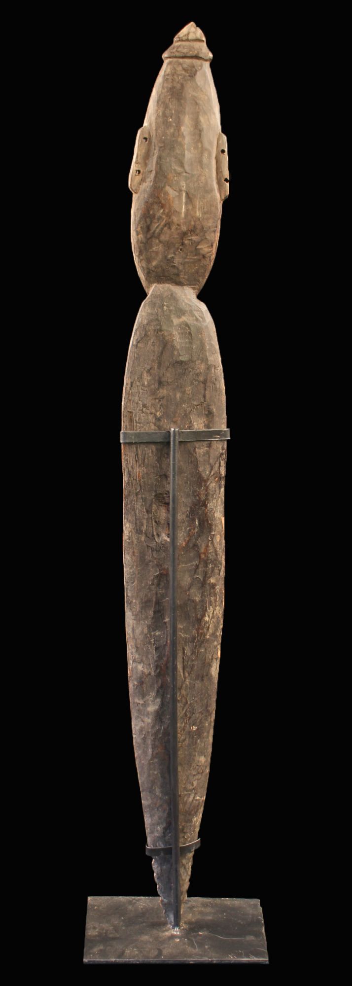 Figure votive représentant un ancêtre dont le corps évoque une pointe de lance ? un battoir à sagou ? Une igname ? Une feuille de pagaie ?... Pièce collectée dans la région des Blackwater en Papouasie Nouvelle Guinée. Bois avec traces d'usage et restes de polychromies. Vendue avec un socle de présentation.
