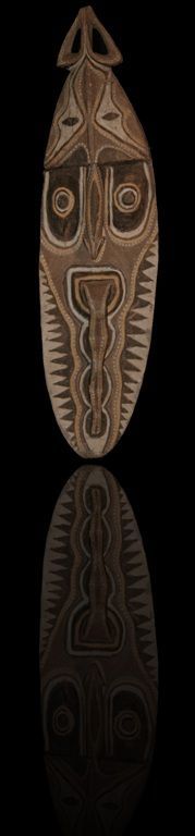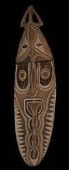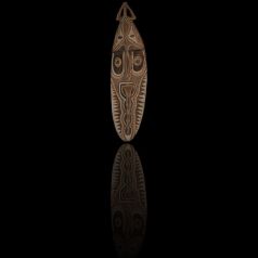Figure de culte dite "Minja" utilisée pour l'une des trois cérémonies dédiée à l'igname. Les figures "Minja" symbolisent la période de croissance de ce tubercule sacré en terre. Collectée dans les monts Waskuk, région du haut Sépik, en Papouasie Nouvelle Guinée (peuple Kwoma), cette figure Minja est particulièrement décorative. Bois et pigments naturels.