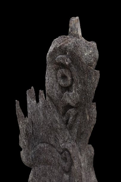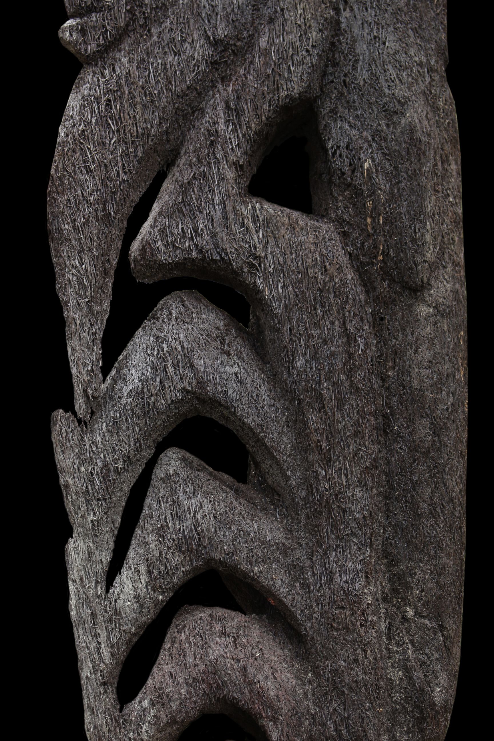 Immense Yipwon sculpté collecté dans le village de Kanangara en Papouasie Nouvelle Guinée. Le Yipwon est l'un des objets les plus stylisés et symboliques de la région du fleuve Sépik. Il représente un personnage en deux dimensions avec une jambe unique, des côtes, son coeur situé en partie centrale et la tête. Les grands spécimens comme celui-ci sont placés dans ou à proximité de la Haus Tambaran (maison des hommes) et sont étroitement liés au monde guerrier. Son autre nom, wanleg (de l'anglais "one leg") en anglais pidgin désigne toutes les figures de ce style que l'on rencontre dans la région de la rivière korewari. Spécimen d'exception en fougère. Très belle pièce unique ...