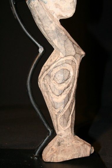 Magnifique figure de culte ypwoon. Les ypwoon sont des personnages puissants que l'on invoque avant de partir à la chasse ou à la guerre. L'esprit du Ypwoon va chercher, trouver et enfin guider le chasseur jusqu'à sa proie. On ne les trouve que dans les régions traversées par les rivières Blackwater, korewori et Korosameri. Ce Ypwoon a la particularité d'être très courbé et d'avoir été enduit de chaux. Sculpture extrèmement fine. Pièce exceptionnelle, exposée et vendue soclée (à noter la prouesse du socleur...)