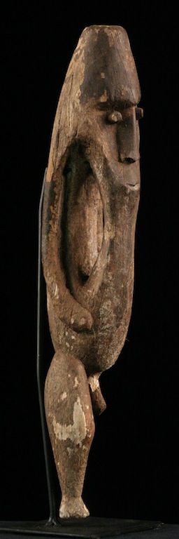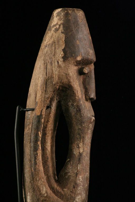Figure de type Kowewori représentant un ancêtre protecteur. Bois marqué et érodé par le temps. Manque ancien de la jambe droite. Vendue avec un socle de présentation. Pièce unique.