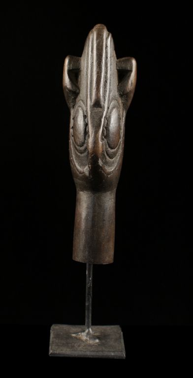 Ancienne extrémité de manche de pagaie finement travaillée et symbolisant deux têtes anthropozoomorphes janus stylisées. Très belle patine d'usage. Bois. Montée sur tige métallique.