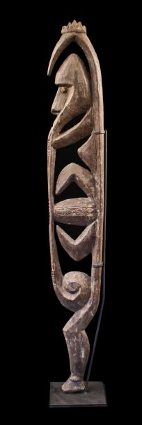 Sculpture papoue appelée "Yipwon" collectée dans le village de Sevenbuck en Papouaise Nouvelle Guinée. Le Yipwon est l'un des objets les plus stylisés et symboliques de la région du fleuve Sépik. Il représente un personnage en deux dimensions avec des côtes, son coeur situé en partie centrale et la tête. Les grands spécimens comme celui-ci sont placés dans la Haus Tambaran (maison des hommes) et sont étroitement liés au monde guerrier. Son autre nom, wanleg (de l'anglais "one leg") en anglais pidgin désigne toutes les figures de ce style que l'on rencontre dans la région de la rivière korewori. Spécimen très finement ouvragé et présentant une belle patine. Très belle pièce vendue avec un socle.