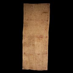 Tapa collecté dans la région de Popondetta en Papouasie Nouvelle Guinée. Le tapa est la première étoffe dont on ait disposé dans cette région du monde. Ses usages étaient variés : vêtement, linceul, couverture, moustiquaire, sac, monnaie de prestige pour certaines pièces de grande qualité. Les tapas de la région de Popondetta sont faits à partir de l'écorce du mûrier à papier. L'écorce est extraite, humidifiée, battue, sechée. Le fait de la battre tasse les fibres et les soude entre elles. Selon le type de battage, l'épaisseur, la texture et la souplesse de l'étoffe varient. Les motifs dessinés évoquent de manière abstraite et symbolique un certain nombre d'évênements ou de faits importants. Le tapa présenté ici est une ancienne jupe de danse. Ecorce battue et pigments naturels.