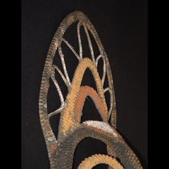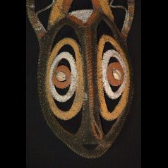 Après la récolte, les ignames sont décorées à l'aide de ces masques et autres éléments de décoration corporelle, et transformées en effigies humaines. Tressage en joncs et pigments naturels.
