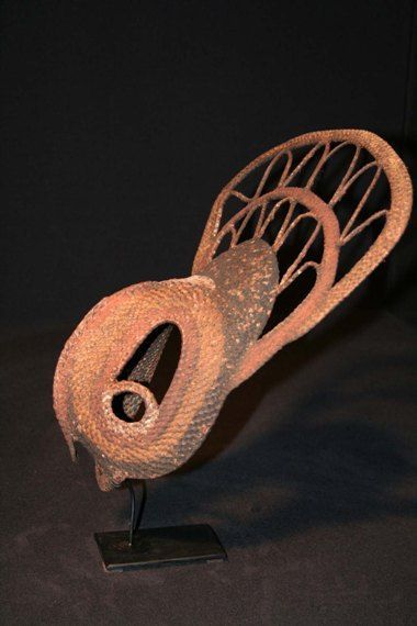 Yam mask on its custom base. After the harvest, the yams are decorated with masks and other body ornaments and so transformed into human effigies. Weaved rush and natural pigments. Used patina. Very pure shape.