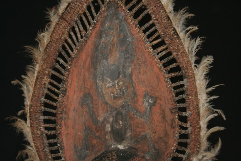 Après la récolte, les ignames sont décorées à l'aide de ces masques et autres éléments de décoration corporelle, et transformées en effigies humaines. Celui-ci a la particularité de comporter un petit panneau d'écorce sur lequel est dessiné un personnage. Tressage en joncs. Objet ayant servi.