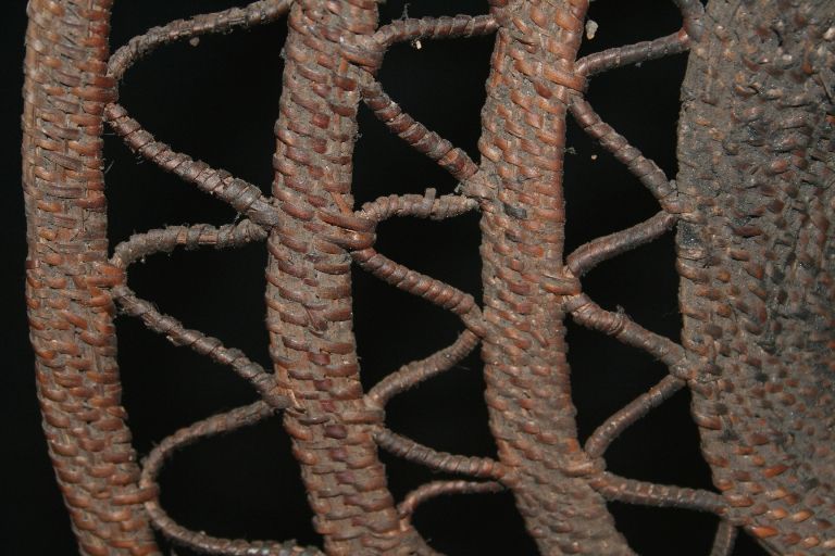 Masque à igname particulièrement esthétique. Les masques à ignames servent à costumer les plus belles ignames selectionnées au moment de la récolte. Ce masque en vannerie représente la tête de l'igname, manière très symbolique de prouver que ces tubercules sacrés ont bien une âme... Jonc tressé et pigments naturels. Tressage particulièrement complexe et finement exécuté. Evocation d'une tête d'oiseau. Présenté et vendu avec son socle sur mesure.