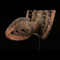 Masque à igname Abelam évoquant une tête d'oiseau. Les masques à ignames servent à costumer les plus belles ignames sélectionnées au moment de la récolte. Cette racine est une des principales sources alimentaires dans la vallée du fleuve Sépik. Ce masque représente la tête de l'igname, manière très symbolique de prouver que ces tubercules sacrés ont bien une âme... Vannerie en joncs et pigments naturels. Vendu avec un socle.