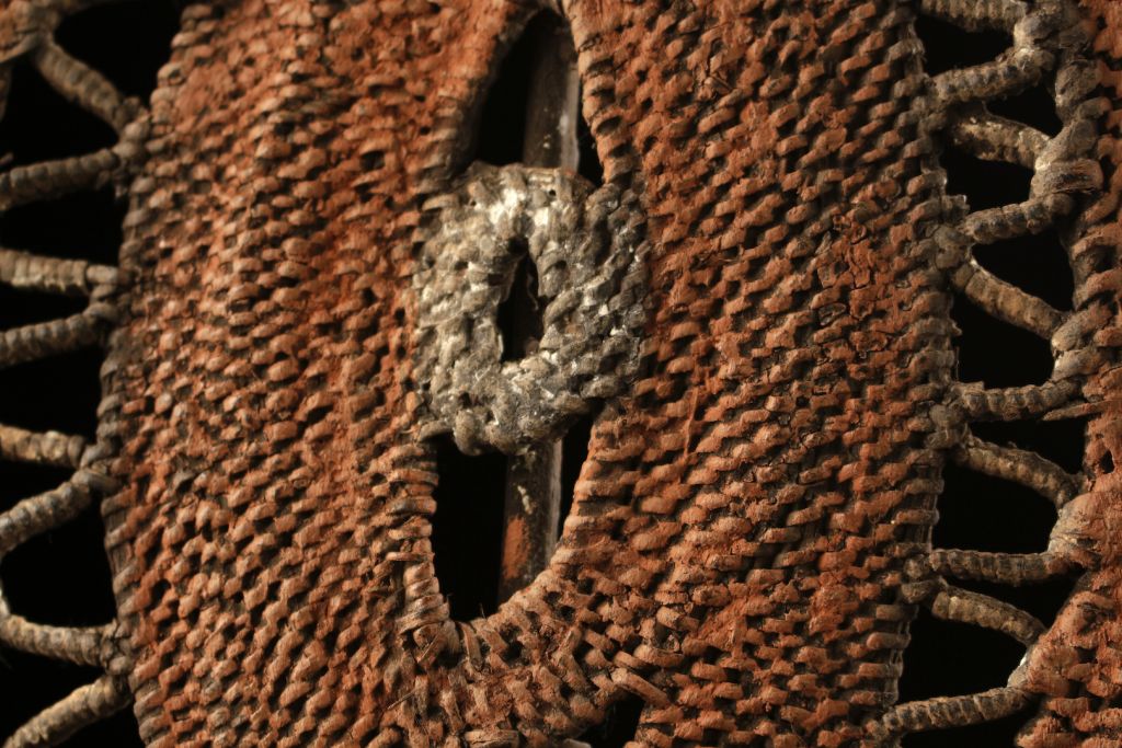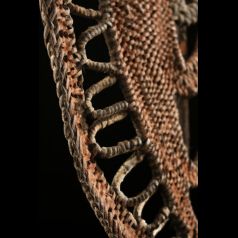 Coiffe en vannerie Abelam. Ce type de vannerie est piqué dans la coiffe des danseurs lors de la cérémonie célébrant la récolte des ignames. Tressage en jonc et pigments naturels. Vendu avec un socle.