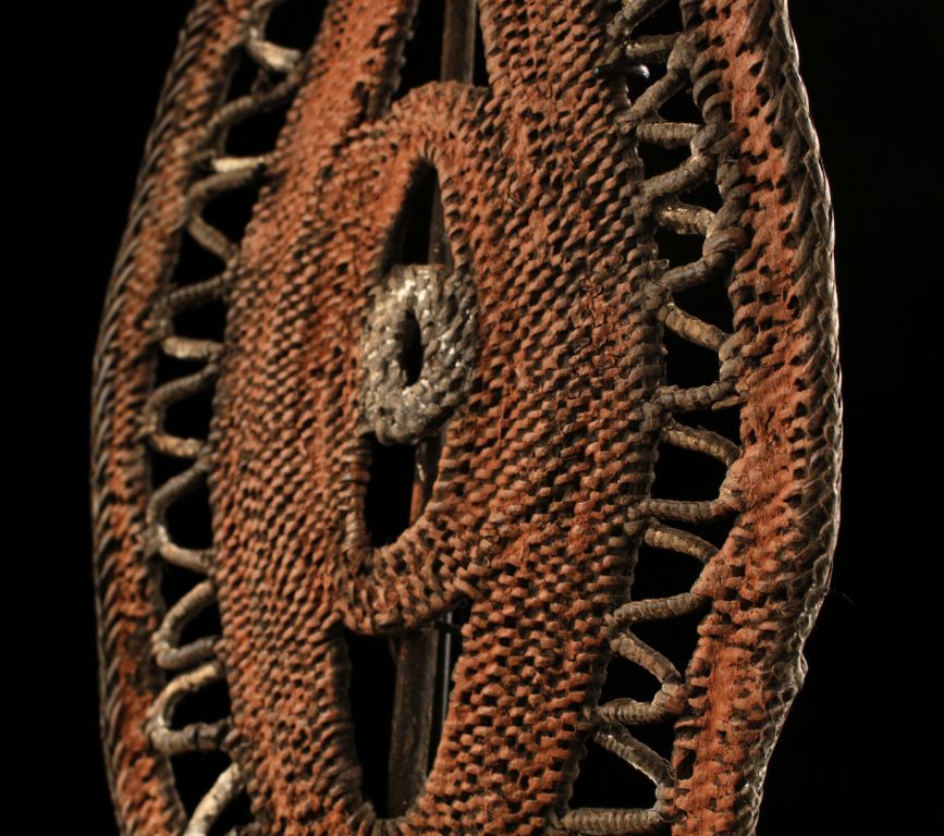 Abelam basketry which decorate the headdress of the dancers during yam harvest ceremony. Rush and natural pigments. Sold with a base.