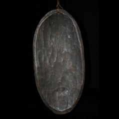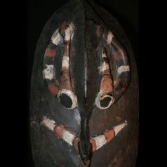 Masque en bois dur représentant un ancêtre spirituel censé protéger son clan d'origine. Langue en forme de tête d'oiseau et sculpture en écailles évoquant une peau de crocodile. Sobre avec de beaux reliefs.