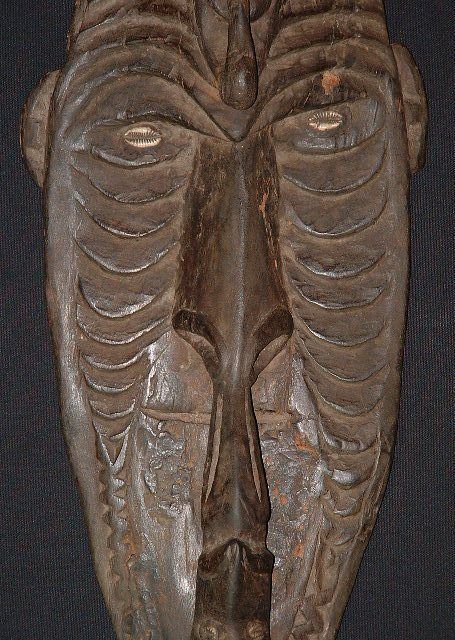 Masque papou représentant un ancêtre spirituel mi humain / mi animal. Collecté dans le village isolé de Maramba, ce masque semble avoir vécu... ;Les quelques manques ici et là (voir photos) et sa patine d'usage en témoignent. Présence de deux visages stylisés au niveau du front et de la bouche/nez. Les "écailles" symbolisent la peau de crocodile, animal sacré symbole de l'origine de la vie sur terre. Masque chargé d'histoire...