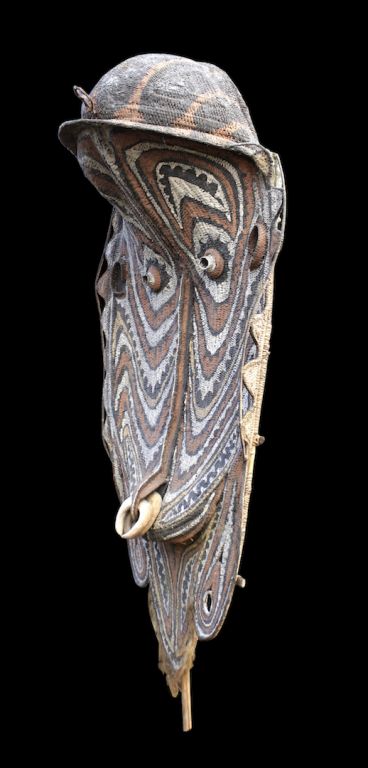 Immense masque en vannerie dit "de pignon" ("gable") communément accroché au-dessus du pignon d'une des entrées ou ouvertures de la maison des hommes. Ces masques ont pour tâche de protéger la tribu des maladies, de la malchance etc. Symboles de la femme protectrice, de la mère et tête de la maison commune. Ce masque a été collecté dans la région des Blackwater, dans le village de kraimbit, en Papouasie nouvelle guinée. Il a été confectionné pour une cérémonie d'initiation et était exposé dans le faîtage de la case. Osier tressé, argile et pigments naturels.