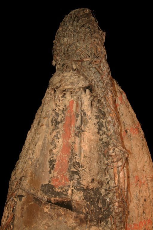 Didagur mask collected in Mariama village in blackwater area. This type of mask in basketry is used during initiations formalities. The hole at mouth level allow to his holder to see. Complex plaiting in cane, sago palm, clay and natural pigments. Sold with a métalic base.