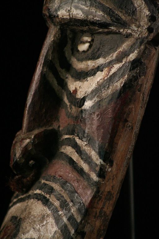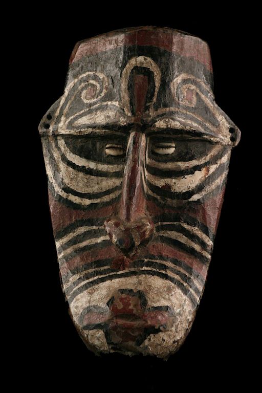 Ancien masque en bois très dense collecté dans la région de l'ethnie Kwoma. Masque ayant probablement été fiché sur un bâton (emplacement visible) pour être exposé dans une case de cérémonie. Bois, coquillages et peinture. Pièce d'exception vendue avec un socle de présentation.
