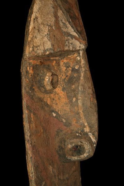 Beautifull Minja cult figure. The minja cult figure are linked to a yam cult that is organized with 3 ceremonies. Yena figures are used during the first one, minja the second one and nogwi the third one. At the end of these 3 ceremonies yams can be dispatched and eaten. People think that they will get a next good harvest thanks to this cycle. Those items have real artistic qualities, Picasso took them as a starting point. Heavy wood, natural pigments. On base.