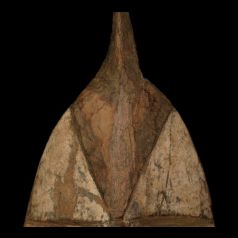 Beau masque de culte Minja en bois dur. Les figures Minja font partie d'un culte de l'igname qui s'organisent autour de 3 cérémonies, chacune d'elle faisant intervenir un objet de culte. Les figures yena sont utilisées pendant la première, les minja pendant la seconde (symbole de la période de croissance des tubercules en terre) et les nogwi la troisième. A la fin du cycle, les ignames sont partagés et consommés et l'on pense que la récolte suivante sera bonne grace à ces rituels destinés à honorer les ancêtres. Ces objets ont de véritables qualités artistiques, picasso s'en est directement inspiré. Figure de l'ethnie Kwoma. Masque monté sur plaque métallique.