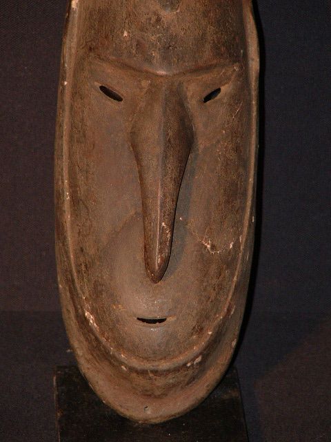 Représentation d'un ancêtre spirituel. Masque présenté et vendu avec son socle. Forme typique de la région des lacs Murik, à l'embouchure du fleuve Sépik en Papouasie Nouvelle Guinée. Visage mi humain / mi oiseau. L'oiseau étant l'animal symbolisant le monde spirituel. Bois fumé sans pigments.
