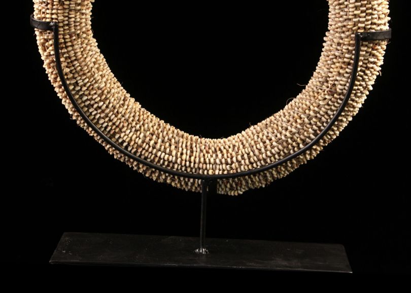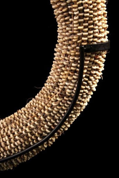 Tolai currency, still used nowadays and having a strong symbolic content. This currency consisted of thousand nassa shells interconnected by splints of wood and rolled up to form a disk, is a currency of compensation. Sold with a custom base.