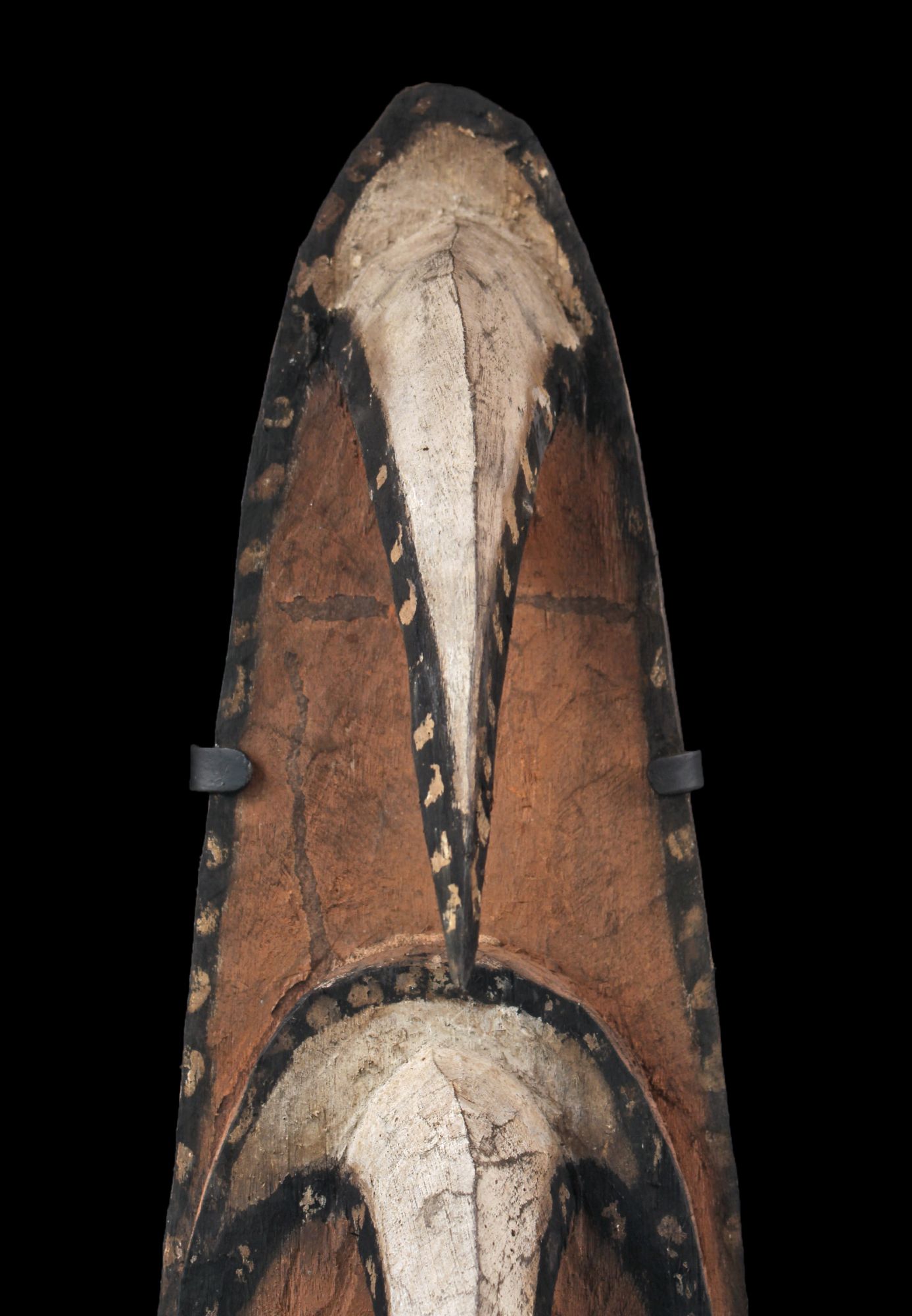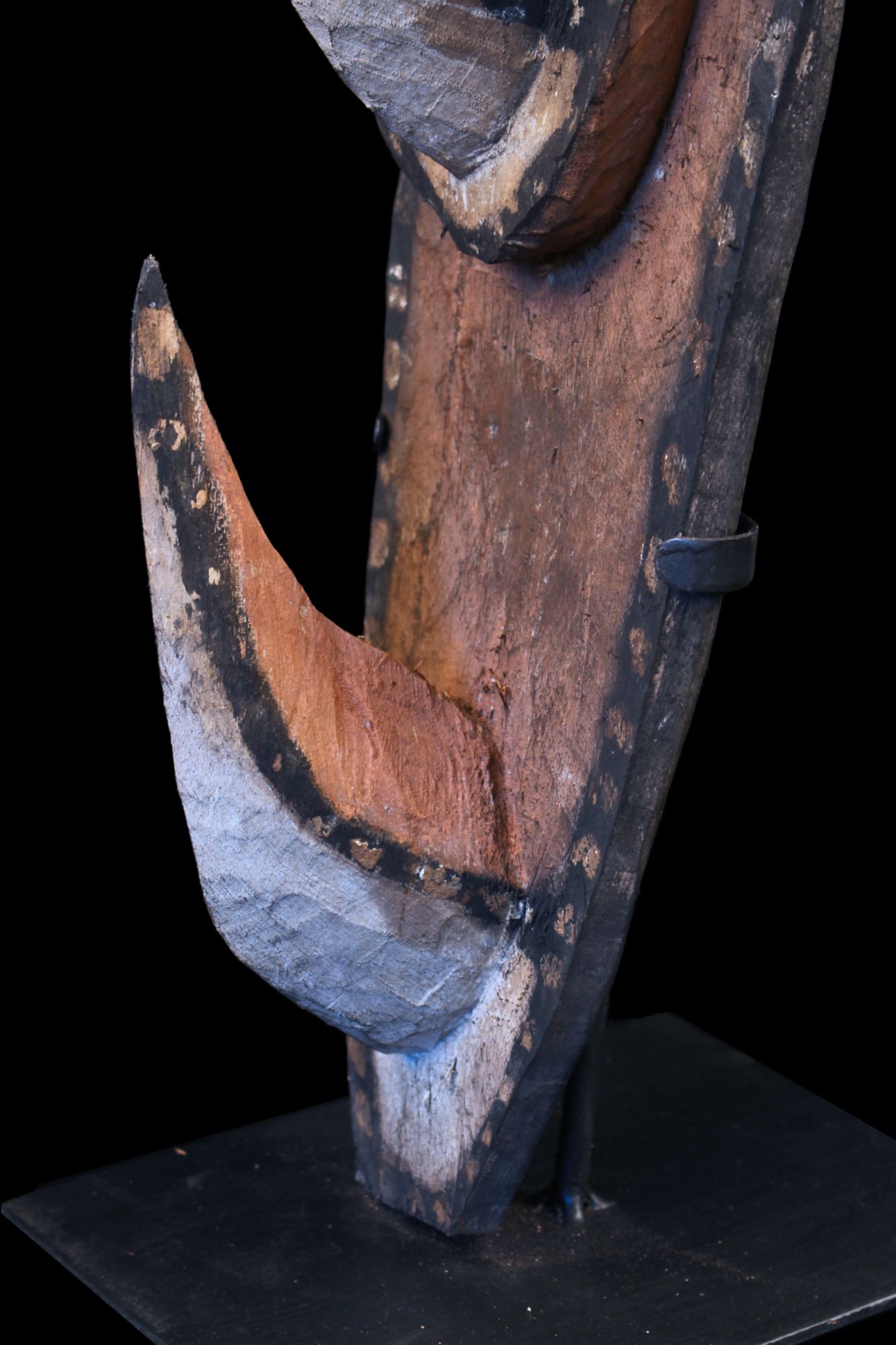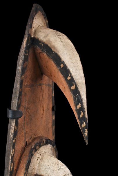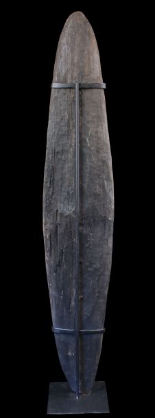 Grand masque dit "Garra" collecté dans le village de Wagu dans la région des Monts Hustein en Papouasie Nouvelle Guinée. Les masques garra représentent les esprits de la brousse et des personnes agés. Les crochets représentent des becs de calao, oiseaux symbolisant la sagesse et la protection. Ce masque a une forme parfaitement équilibrée et est, de ce fait, réellement esthétique... Ethnie Bahinemo. Bois, et pigments naturels. Exposé et vendu avec son socle.