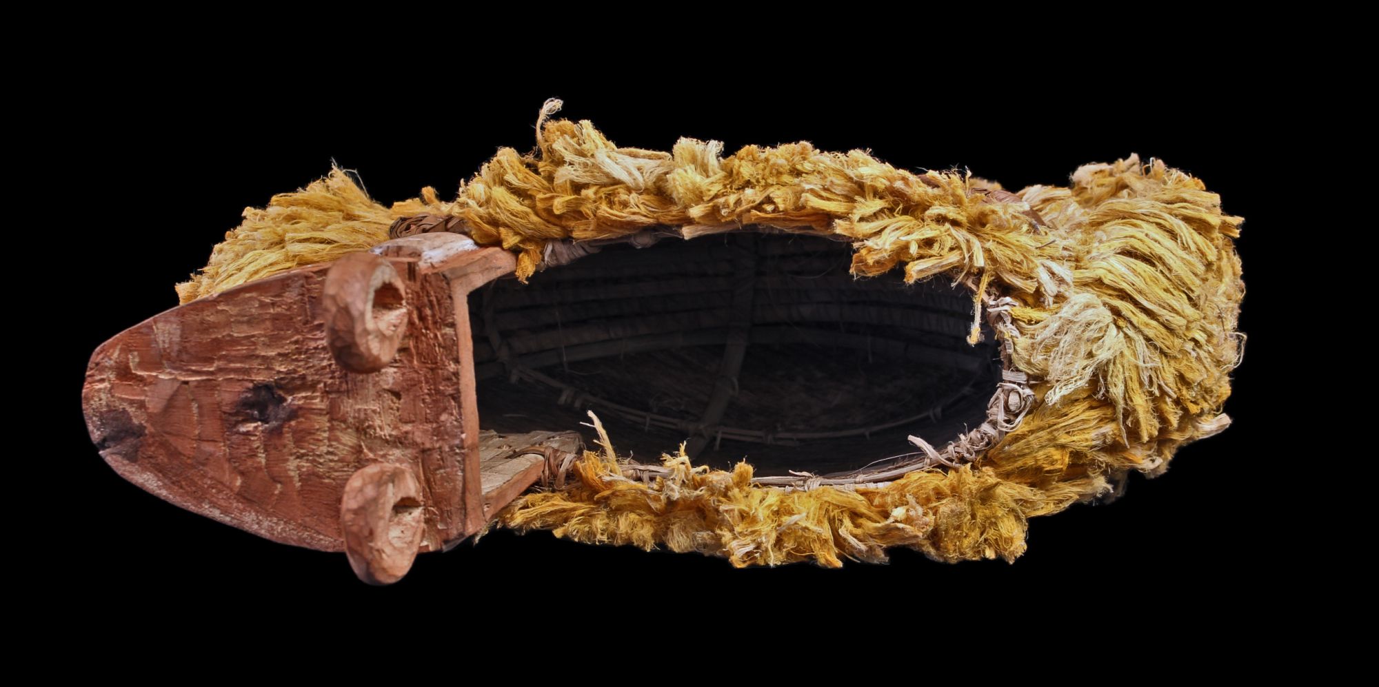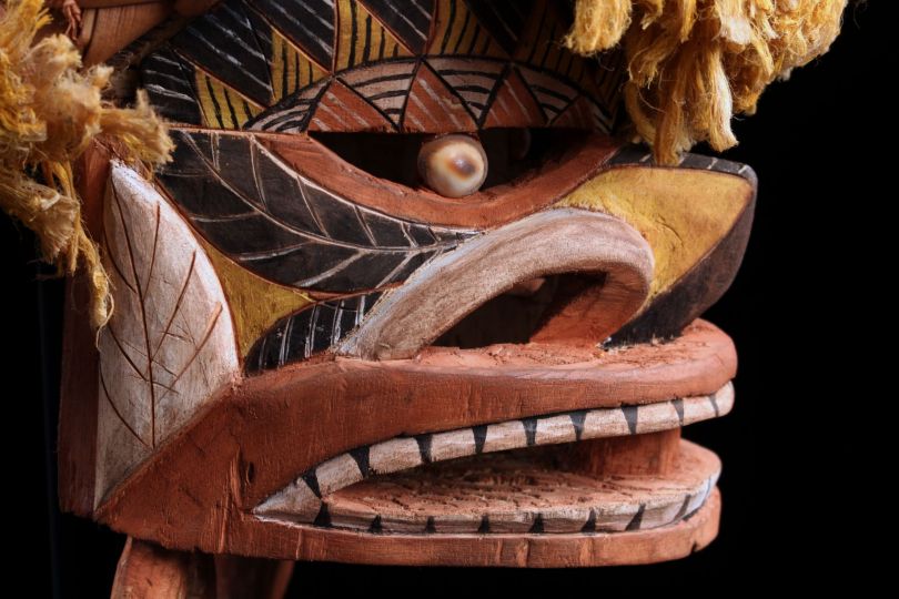 Spectaculaire et rare masque de danse Malagan venant des îles Tabar en Papouasie Nouvelle Guinée. Ce masque appelé "Tatanua" représente l'âme dont dispose une personne et sert lors de cérémonies de commémoration. Ces masques en bois relativement léger sont portés lors de danses rituelles. Bois, fibres végétales dont de pandanus, écorce de cocotier, coquillages "Oeil de Sainte Lucie" (Turbo) et pigments naturels. Vendu avec un socle de présentation.