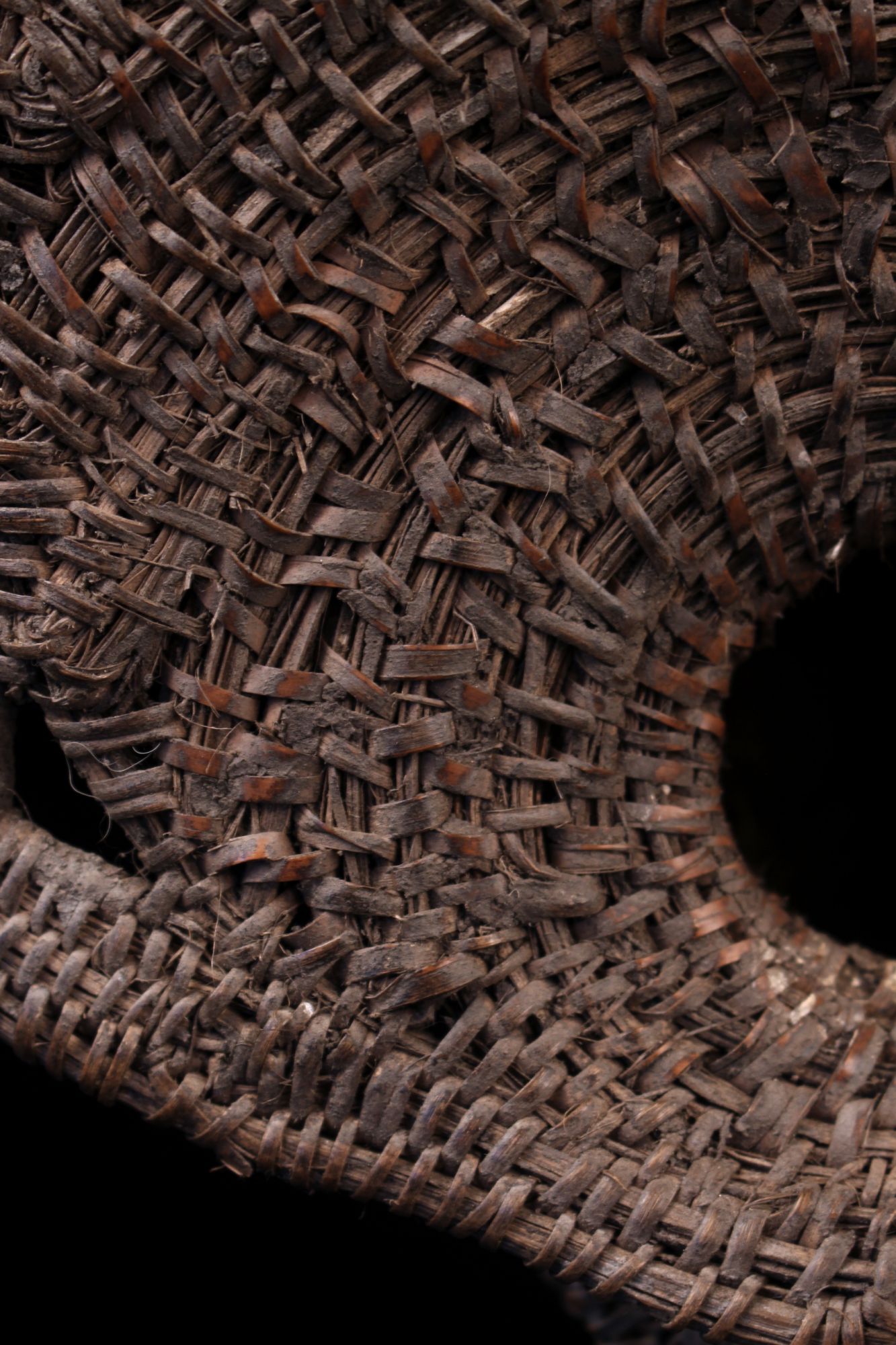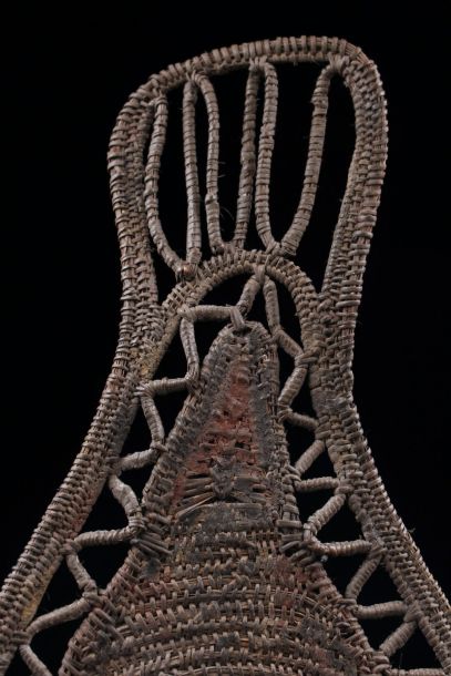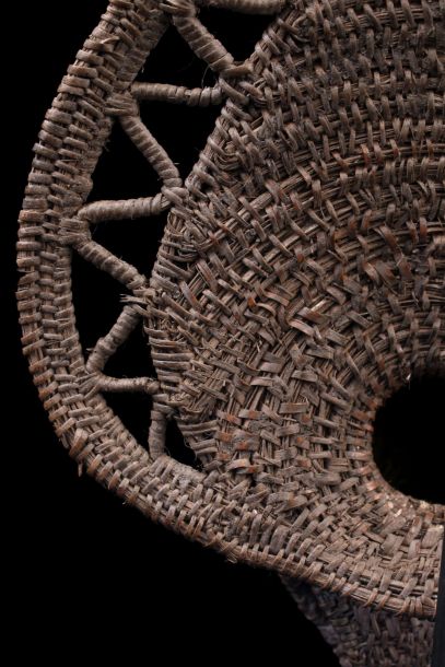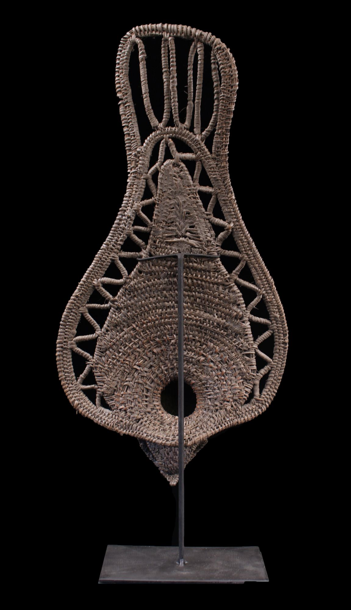 Masque à igname vendu avec un socle et présentant une belle patine d'usage. Ici la représentation d'une tête de cacatoès. Après la récolte, les ignames sont décorées à l'aide de ces masques et autres éléments de décoration corporelle pour être transformées en effigies humaines. Tressage en joncs et traces de pigments naturels. Vendu avec un socle.