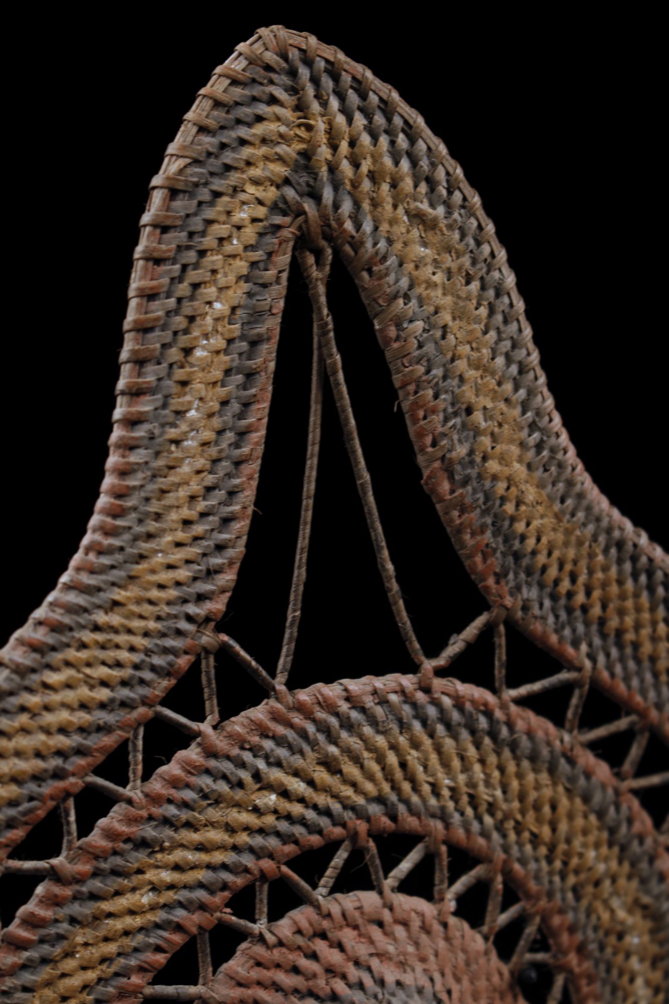 Yam mask collected in the village of Maprik in Papua New Guinea. Yam masks are used to dress up the most beautiful yams selected at harvest time. This basketwork mask represents the head of the yam, a very symbolic way of proving that these sacred tubers do indeed have a soul... Braided rush and natural pigments. Sold with a stand. Free Shipping.